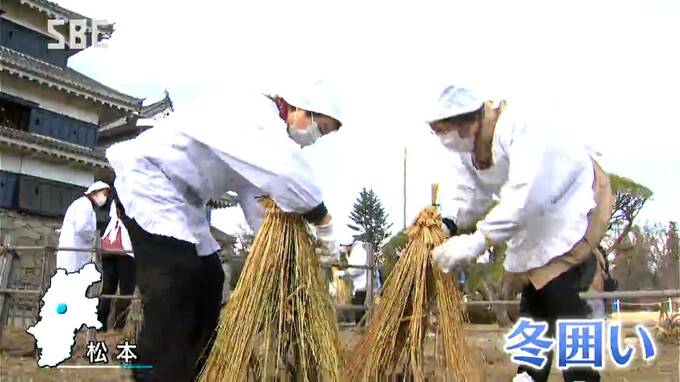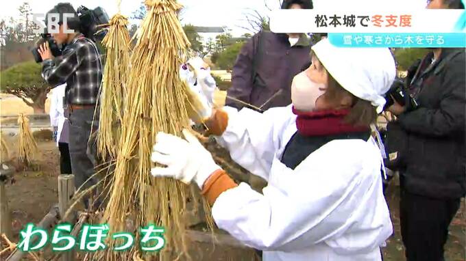 国宝・松本城の「冬囲い」。雪や寒さから木々を守ります。