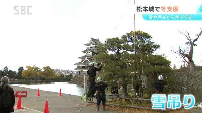 また、松本城公園の松の木にも造園業者が「雪吊り」を施し、雪への備えを行っていました。