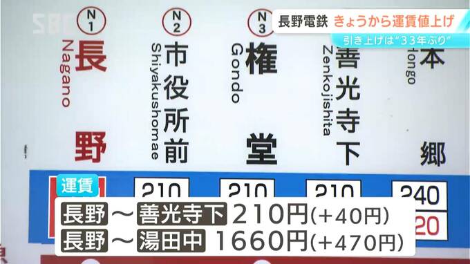 初乗りの区間にあたる長野駅から善光寺下駅までは40円上がって210円に、長野駅から湯田中駅までは470円上がって1660円になります。