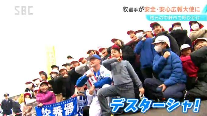 交通安全や特殊詐欺の被害防止などを呼びかける「安全・安心広報大使」。その第一号が牧選手です。集まった中野小学校の子どもたちとおなじみのポーズも!