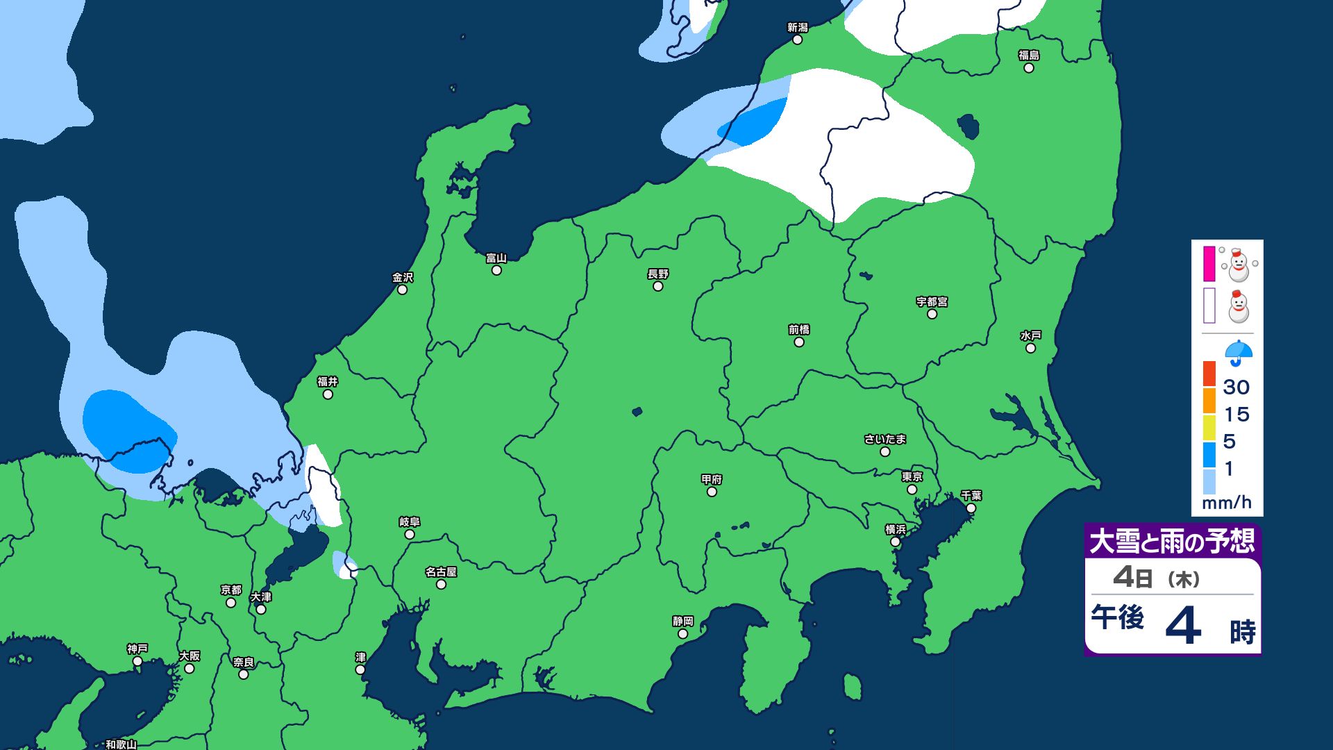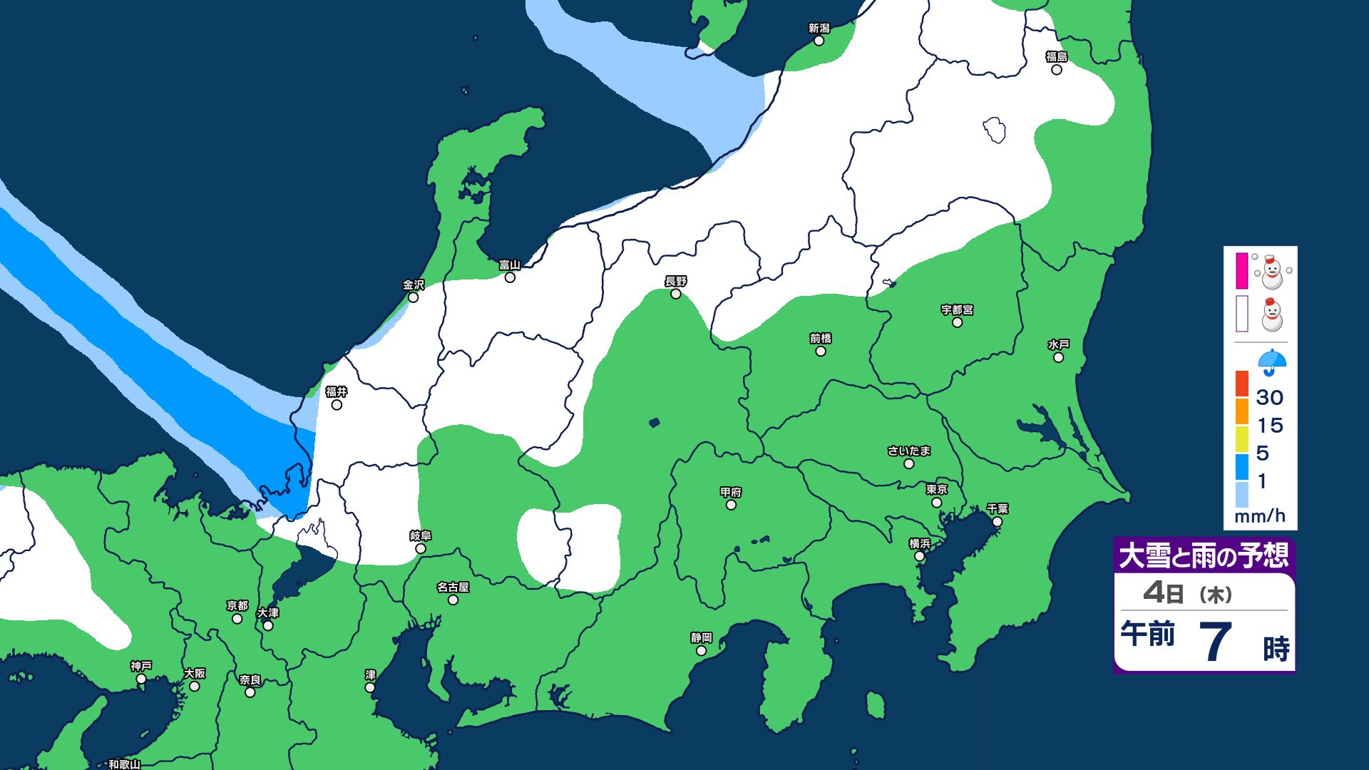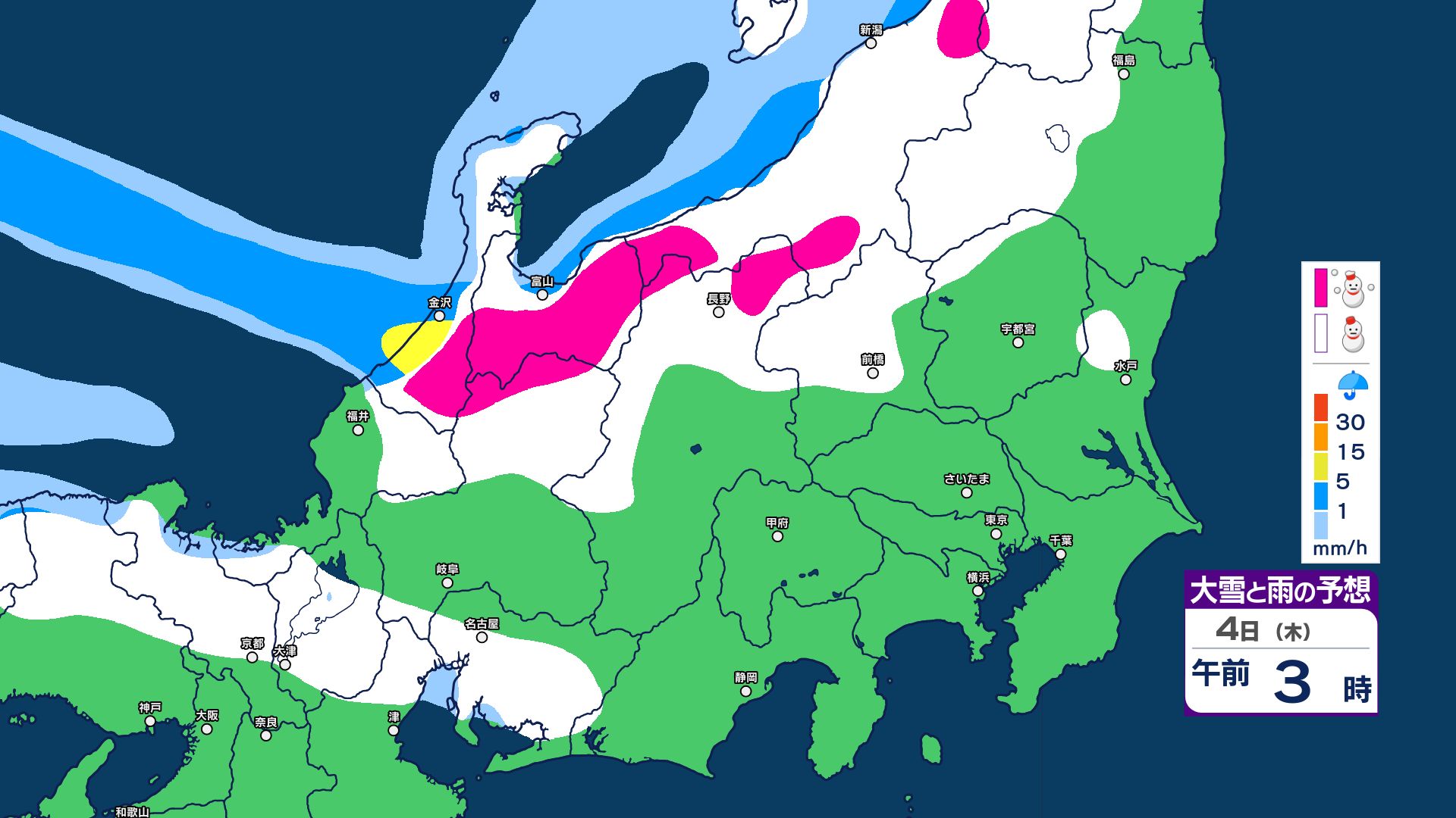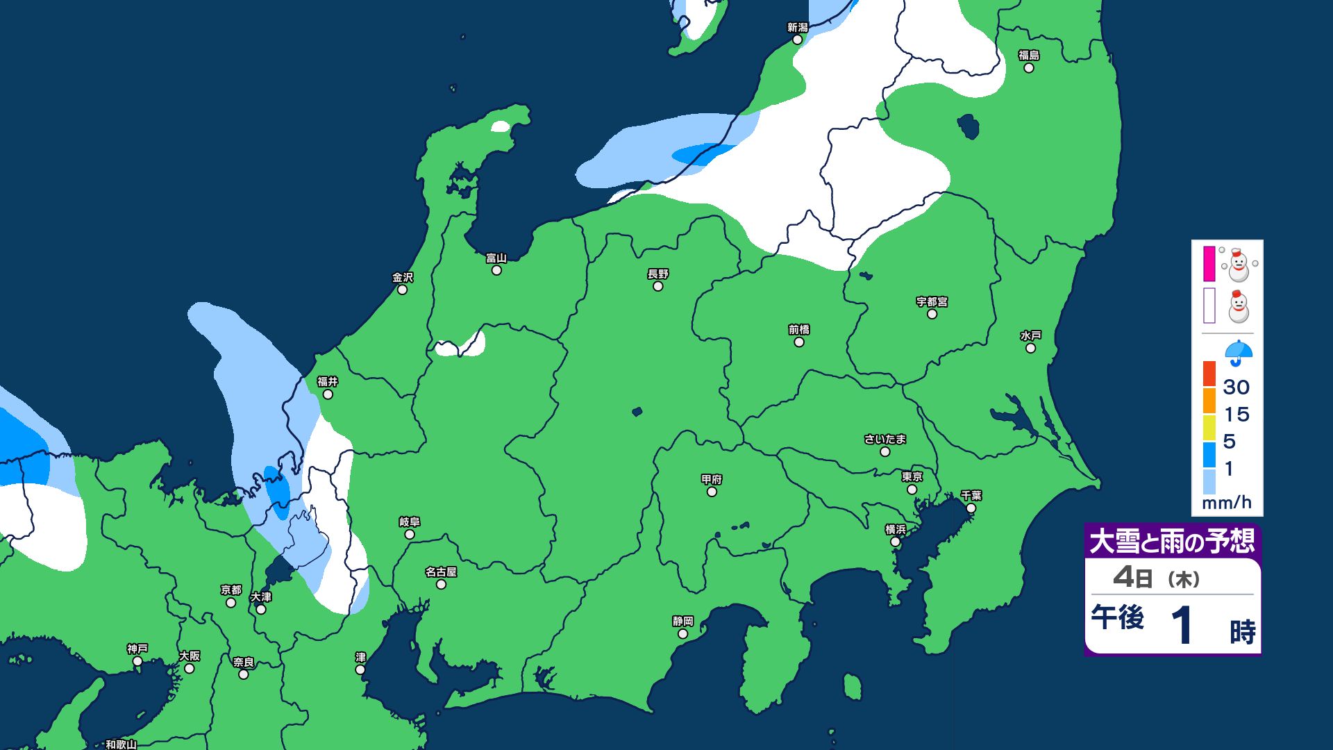 【大雪情報】関東甲信 冬型の気圧配置強まる 3日夜~4日昼前にかけ【雪と雨のシミ…