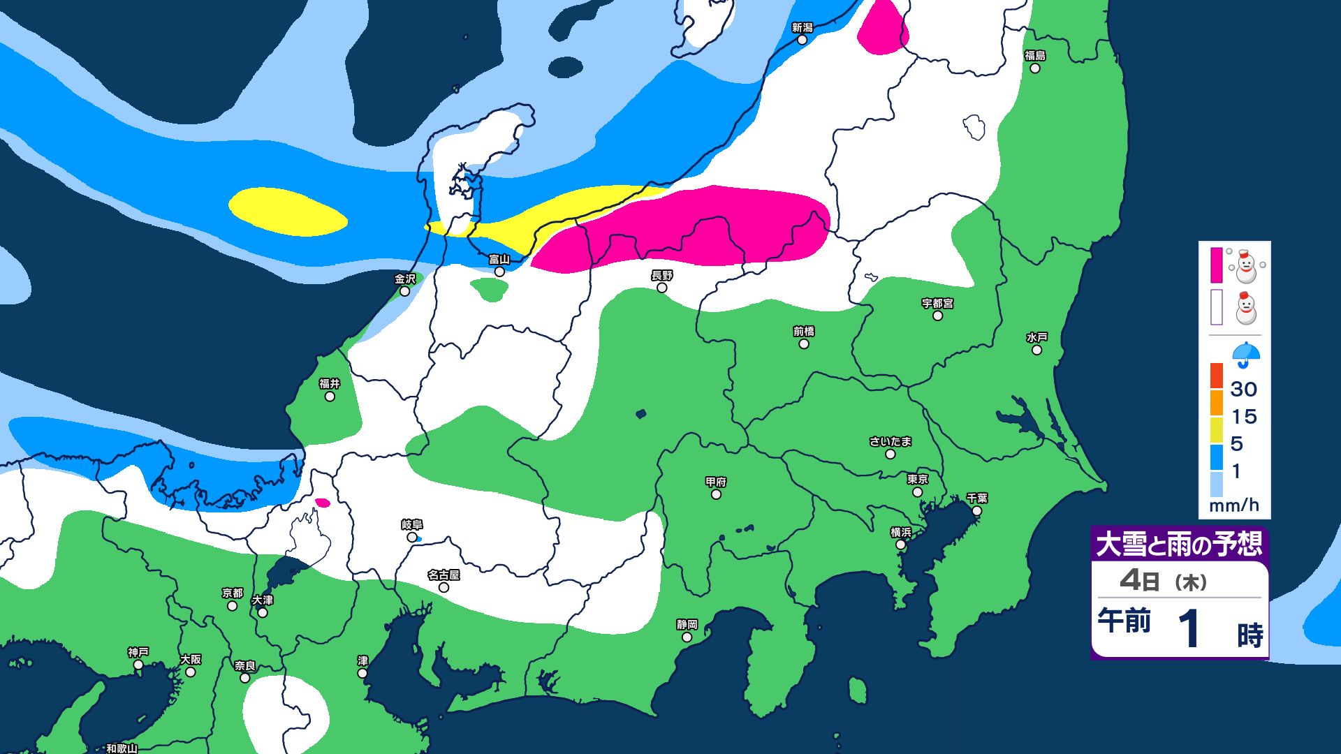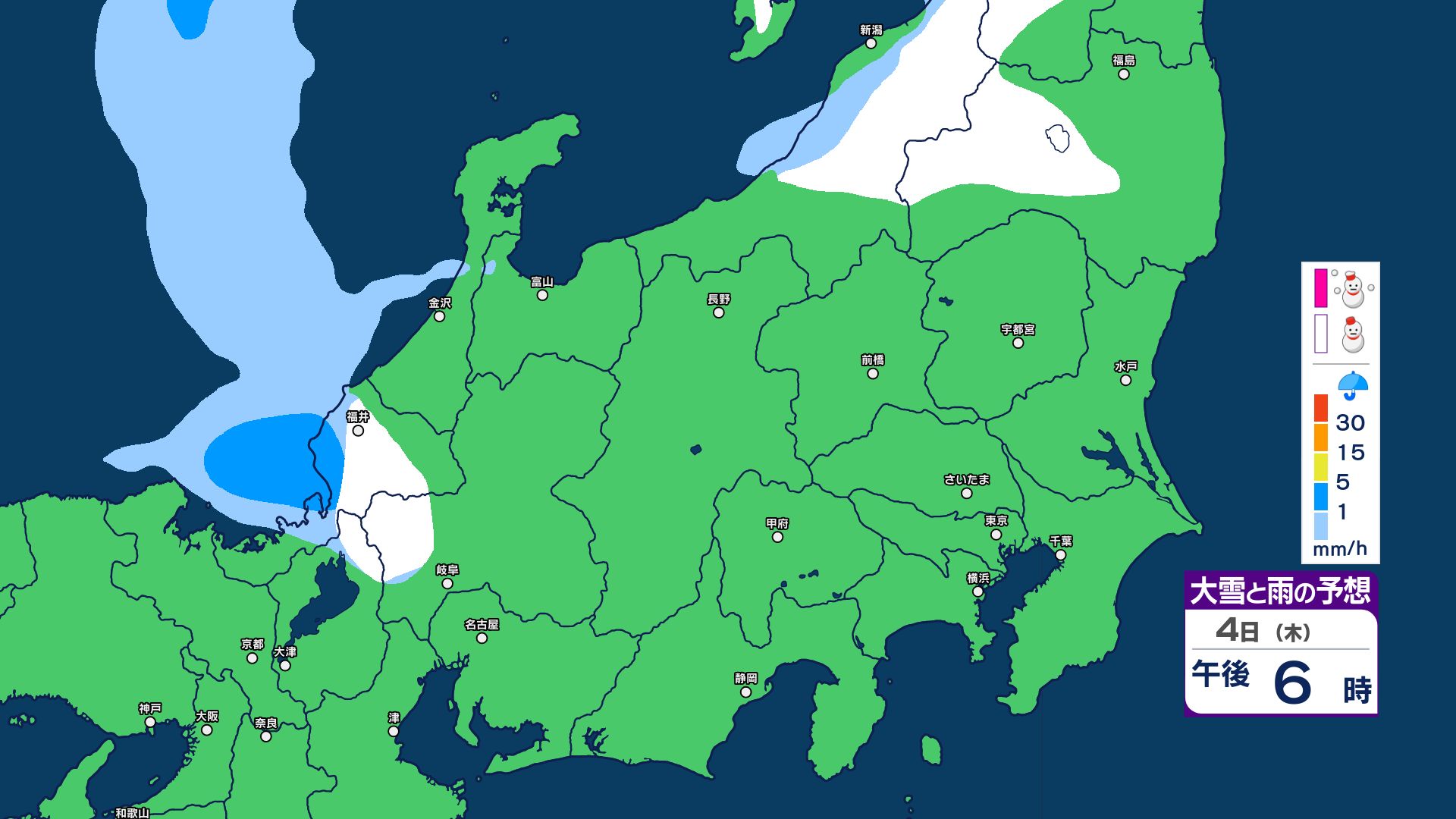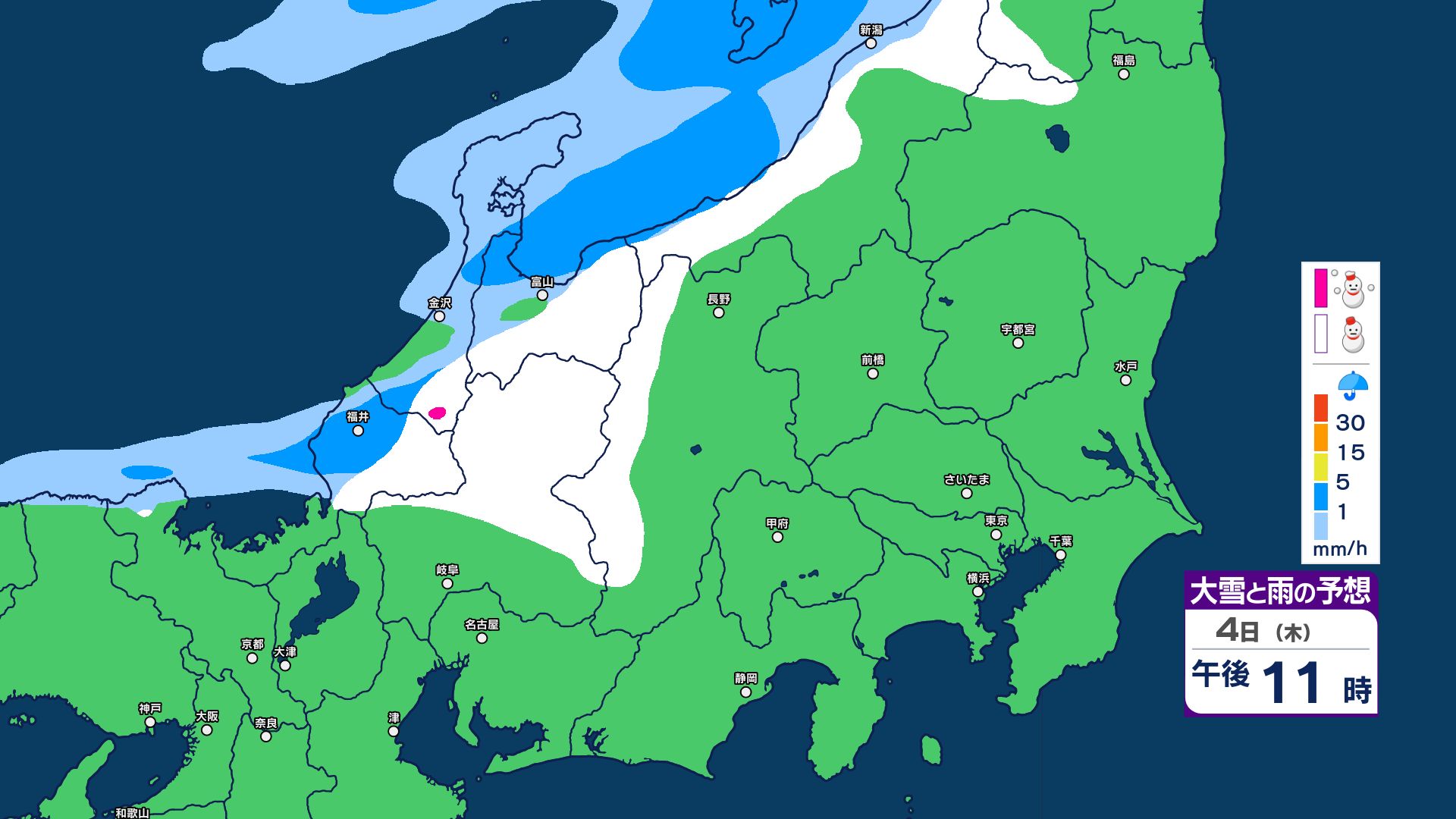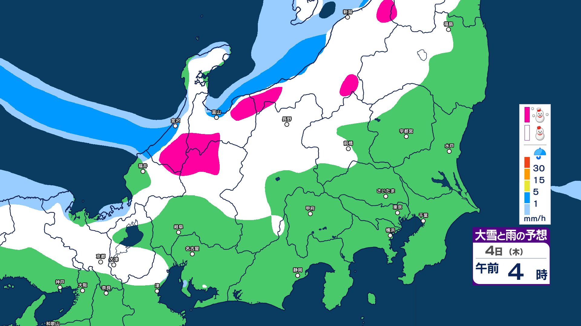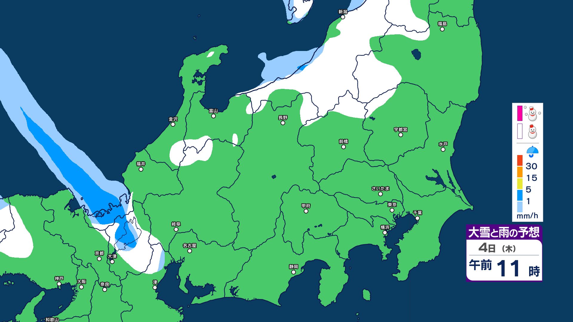 【大雪情報】関東甲信 冬型の気圧配置強まる 3日夜~4日昼前にかけ【雪と雨のシミ…