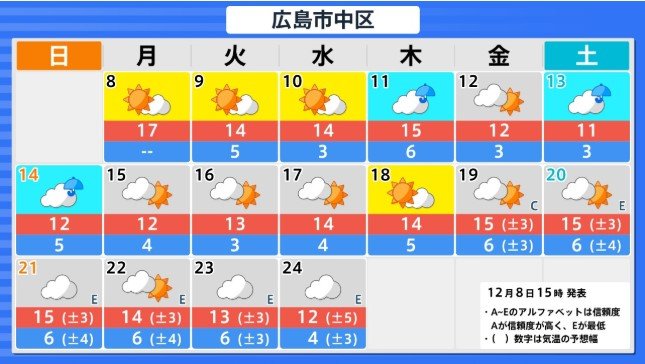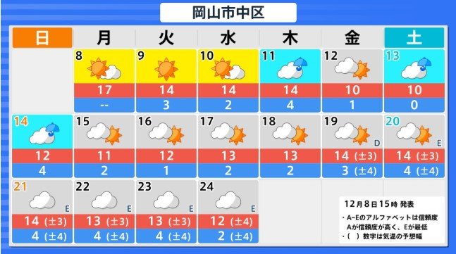 中国地方の向こう2週間の気温は、寒気の影響を受けにくいため平年並か高い日が多く、17日頃からはかなり高くなる可能性があります。農作物の管理等に注意してください。