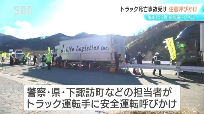 長和町の新和田トンネル旧料金所では、警察や県、下諏訪町などの担当者が国道を通るトラックの運転手に安全運転を呼びかけるチラシなどを配りました。