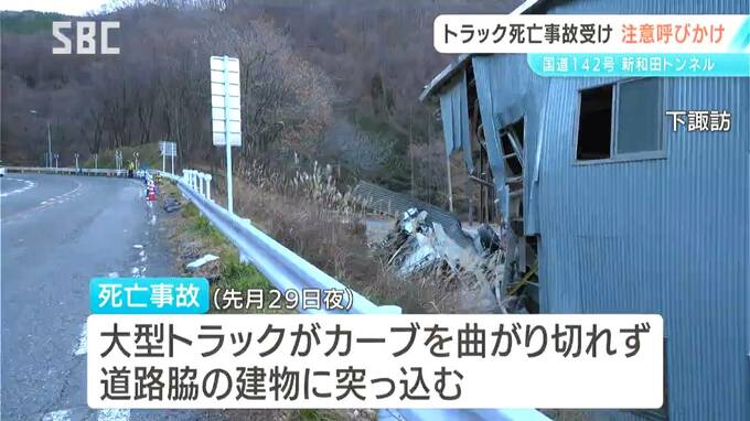 下諏訪町の国道で大型トラックが横転し道路わきの建物に突っ込んだ死亡事故を受けて、警察などがトラックドライバーに安全運転を呼びかけました。