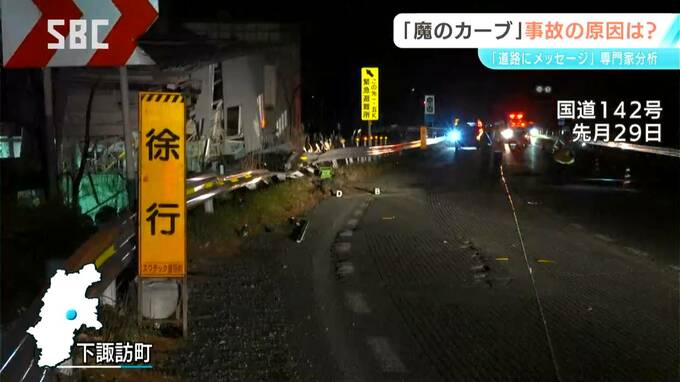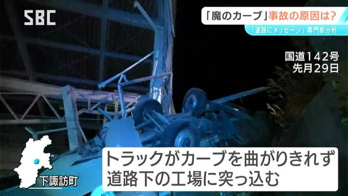 国道142号は東信と諏訪地方を結ぶトラックの通行量が多い道路です。佐久方面から新和田トンネルを抜けて、標高差でおよそ300メートル下ったやや急な右カーブで事故は起きました。2年で2件の死亡事故が起きた「魔のカーブ」。なぜ事故が相次ぐのか取材しました。