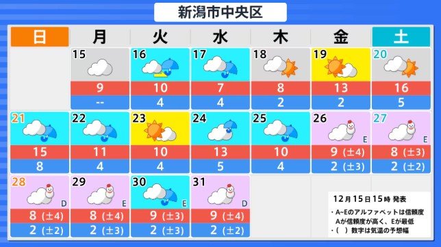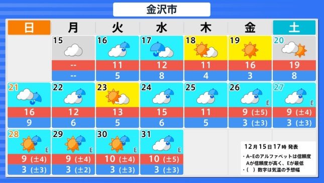 北陸地方の向こう2週間の気温は、寒気の影響が弱く、暖かい空気が流れ込む日もあるため高い日が多く、20日頃からはかなり高くなる見込みです。農作物の管理等に注意してください。
