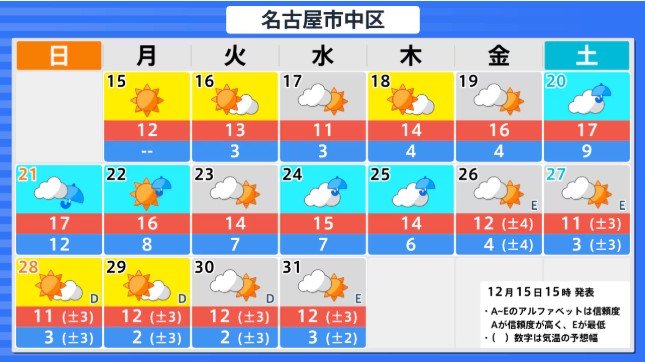 東海地方の向こう2週間の気温は、寒気の影響が弱く、暖かい空気が流れ込む日もあるため高い日が多く、20日頃からはかなり高くなる見込みです。農作物の管理等に注意してください。