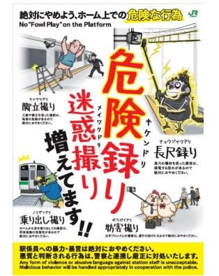ポスターは、「危険録り迷惑撮り増えてます!!」の文字を中心に配置し、その周囲に、脚立を使っての撮影や、ホームから身を乗り出しての撮影、長い棒状の機材を使った録音、点字ブロックの上で撮影するといった4つのホーム上での危険な行為をイラストとともに載せ、絶対に行わないよう呼びかけています。