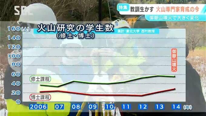 火山研究はすぐには成果が出ない分野でもあり、大学院に進む学生は少なく、特に研究者の入り口となる博士課程への進学者は2000年代初めには全国で20人を切る状況が続いていました。
