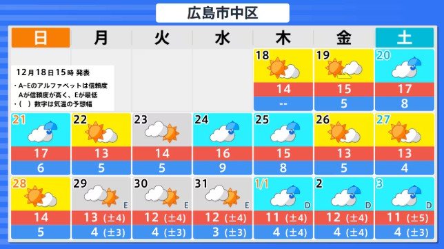 中国地方の向こう2週間の気温は、寒気の影響が弱く、暖かい空気が流れ込む日もあるため高く、かなり高くなる日もあるでしょう。農作物の管理等に注意してください。