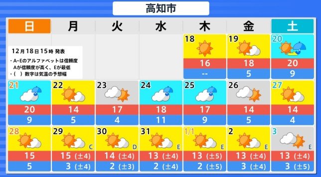 四国地方の向こう2週間の気温は、寒気の影響が弱く、暖かい空気が流れ込む日もあるため高く、かなり高くなる日もあるでしょう。農作物の管理等に注意してください。