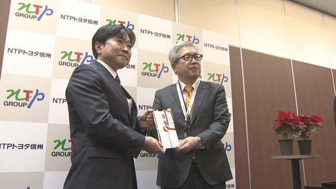 寄付を行ったのは、松本市に本社を置く自動車販売会社のNTP(エヌティーピー)トヨタ信州で、県児童福祉施設連盟におよそ50万円を贈りました。