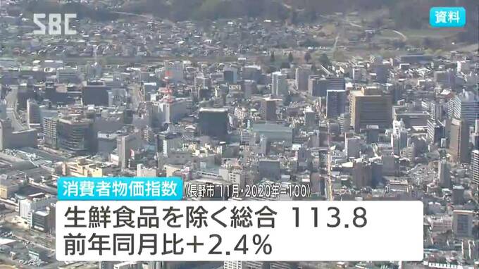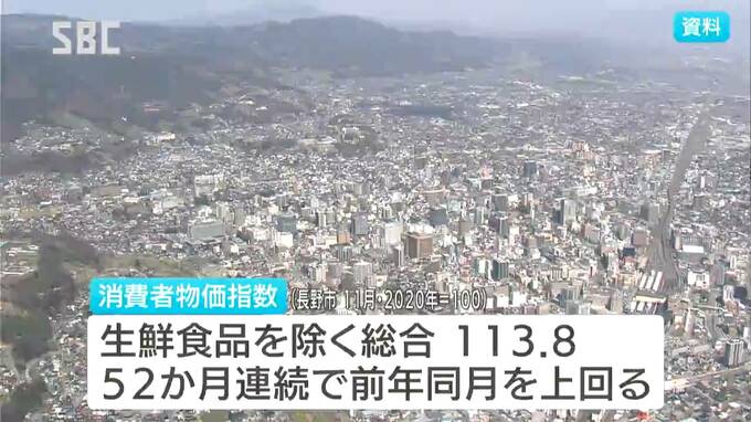 長野市の11月の消費者物価は、生鮮食品を除く総合で、2020年を100とした指数が113.8となり、去年の同じ月に比べ2.4%上昇しました。前の年の同じ月を上回るのは52か月=4年4か月連続です。
