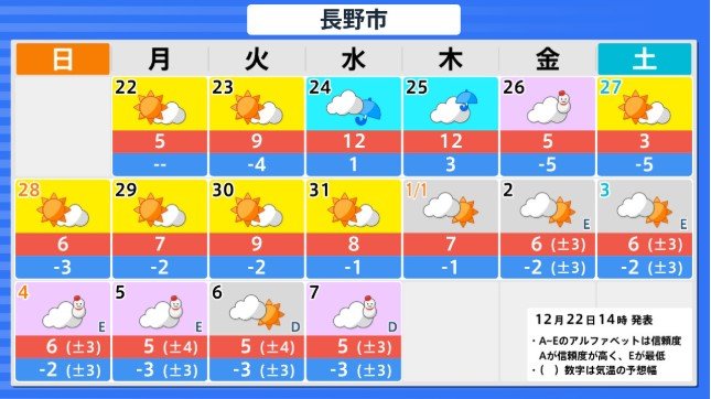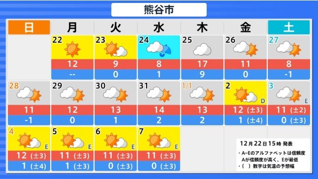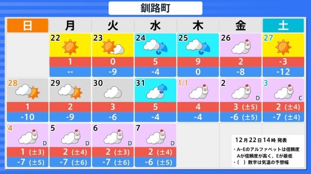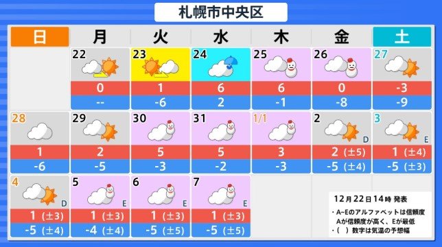 北海道地方の向こう3日間程度は寒気の影響が弱いため高い日が多く、かなり高い日もありますが、12月26日からの3日間程度は平年並か低いでしょう。その後は寒気の影響が弱まるため、かなり高くなる見込みです。農作物の管理等に注意してください。