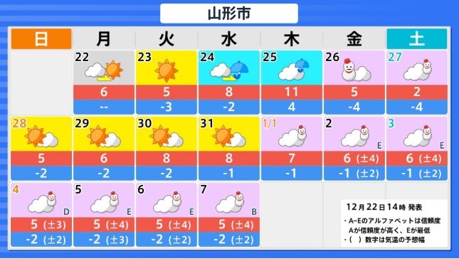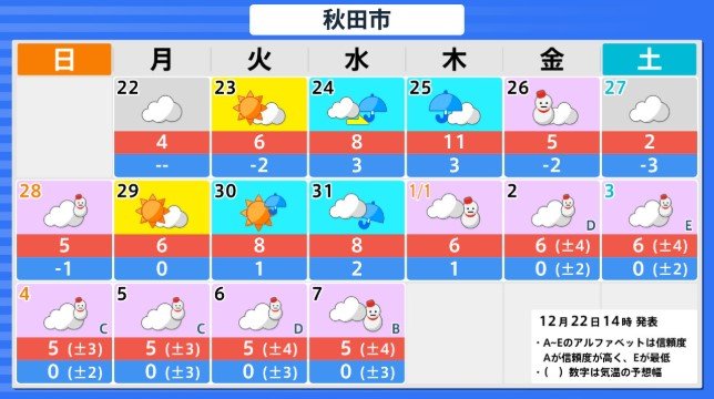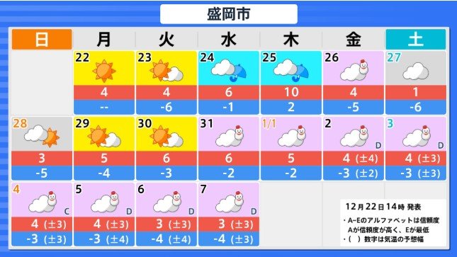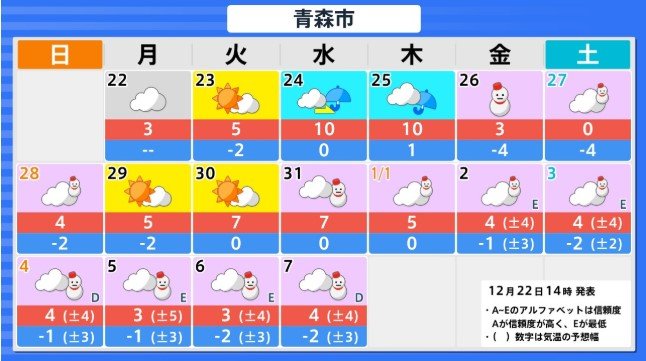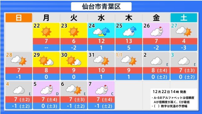 東北地方の向こう3日間程度は寒気の影響が弱いため高い日が多く、かなり高い日もありますが、12月26日からの3日間程度は平年並か低いでしょう。その後は寒気の影響が弱まるため、かなり高くなる見込みです。農作物の管理等に注意してください。