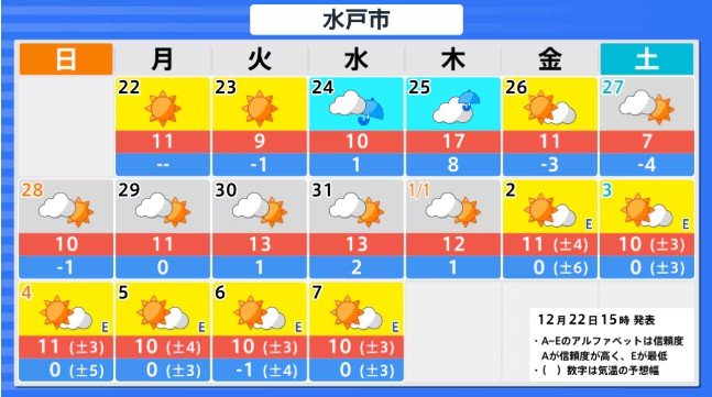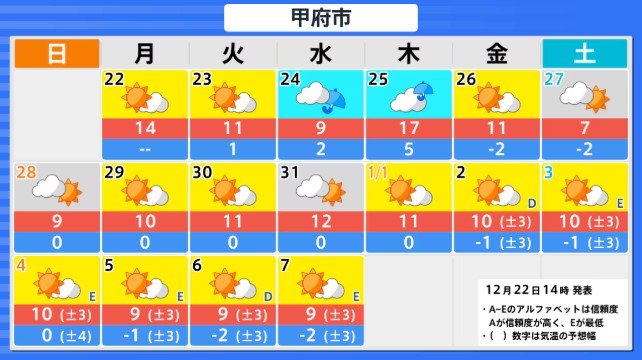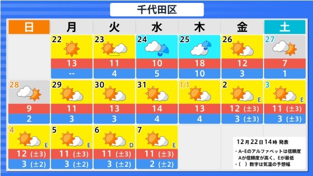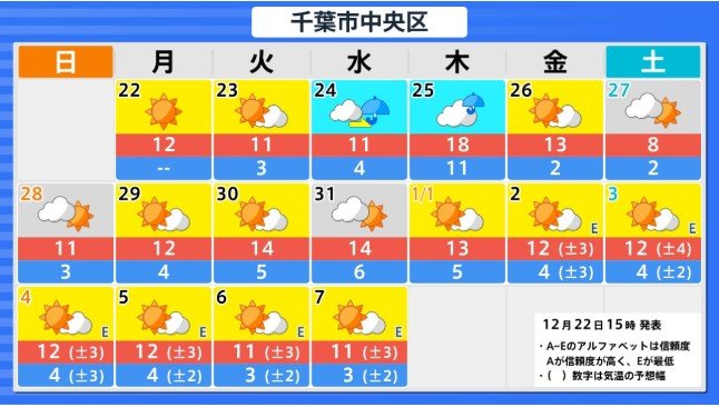 関東甲信地方の向こう4日間程度は寒気の影響が弱いため高い日が多く、かなり高い日もありますが、12月27日からの2日間程度は平年並か低いでしょう。その後は寒気の影響が弱まるため、かなり高くなる可能性があります。農作物の管理等に注意してください。