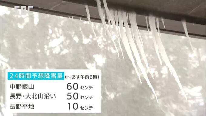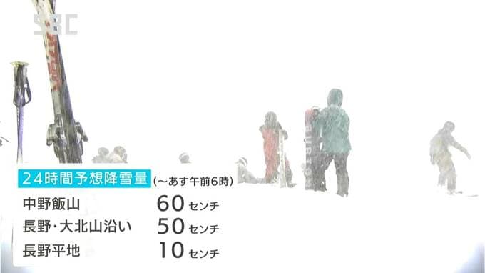 27日午前6時までに予想される24時間の降雪量は、いずれも多いところで中野飯山地域で60センチ、長野地域と大北地域の山沿いで50センチ、長野地域の平地で10センチなどとなっています。