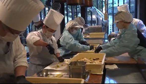 隣接する和食レストランとあわせて、およそ500個の注文が入っているということで、料理を仕込んだり重箱に詰めたりと、厨房は大忙しです。