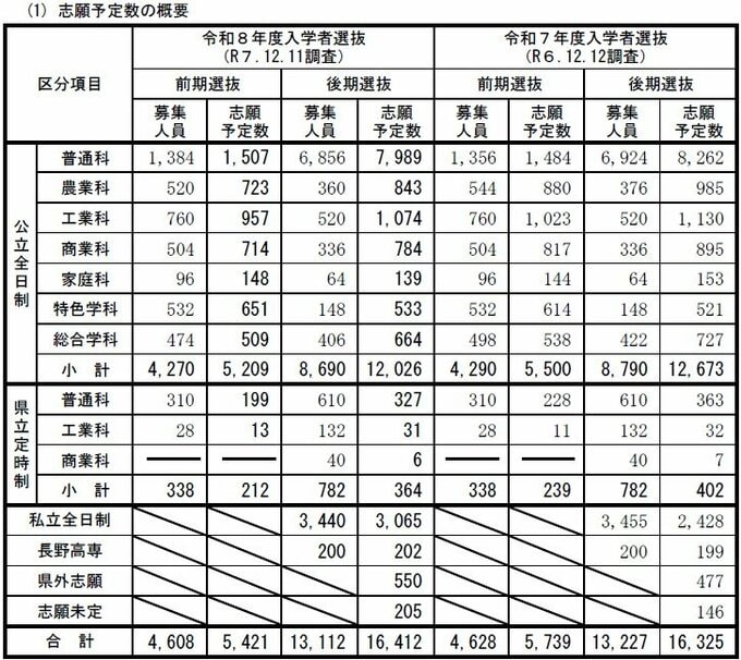 調査は、県教育委員会が2025年12月11日に中学3年生を対象に行ったもので、高校を志願する予定の生徒はおよそ1万6412人で、2024年の調査より87人増えました。
