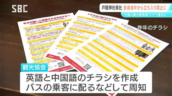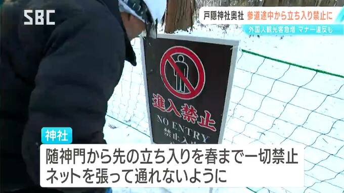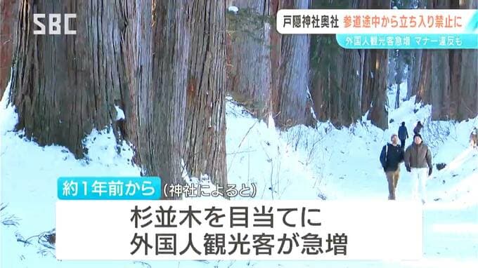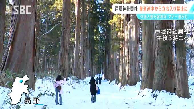 冬に訪れる外国人観光客が増えている長野市の戸隠神社奥社が参道の途中にネットを張って立ち入りを禁止するなどの規制を強化しました。