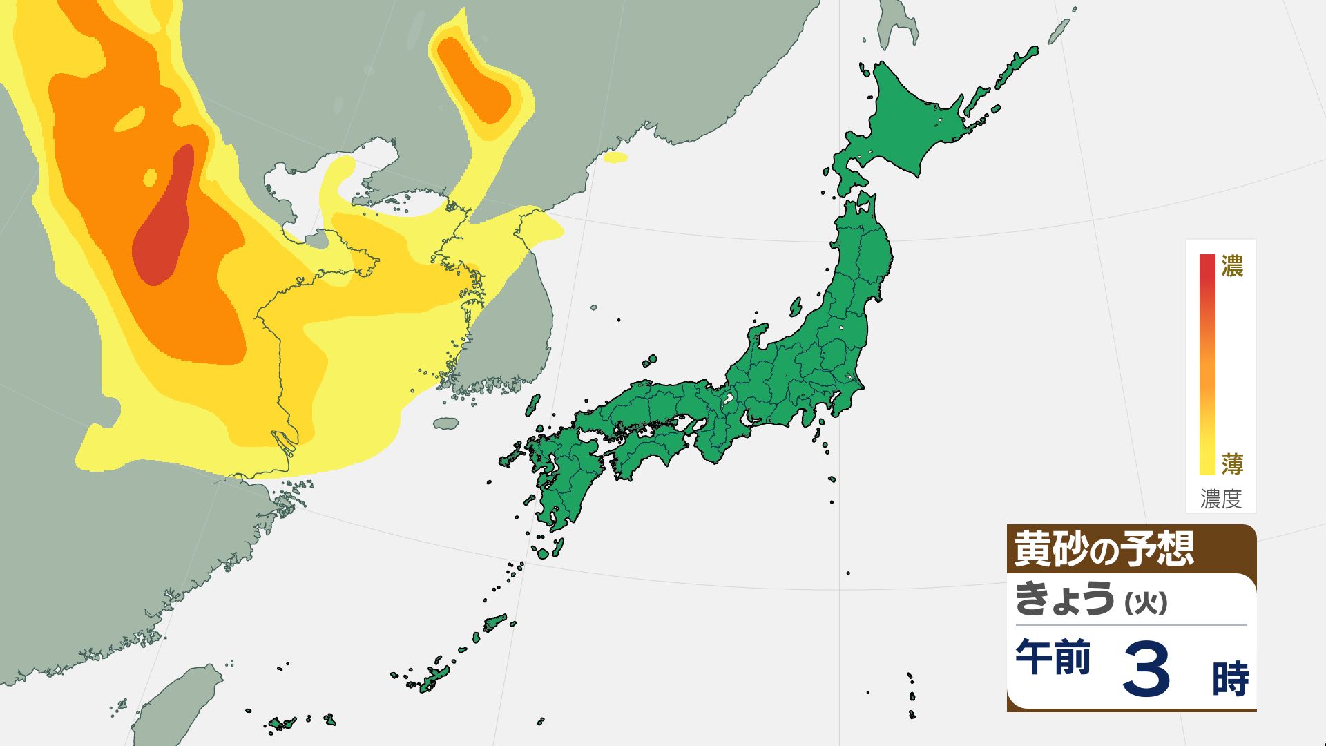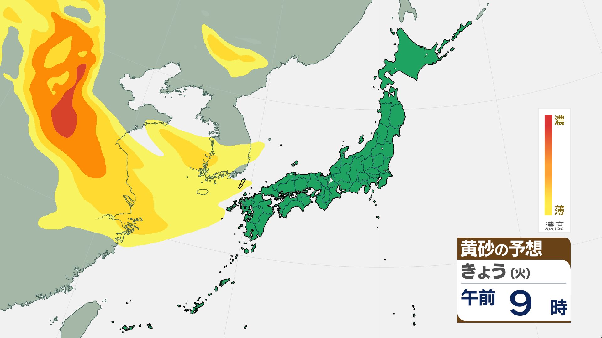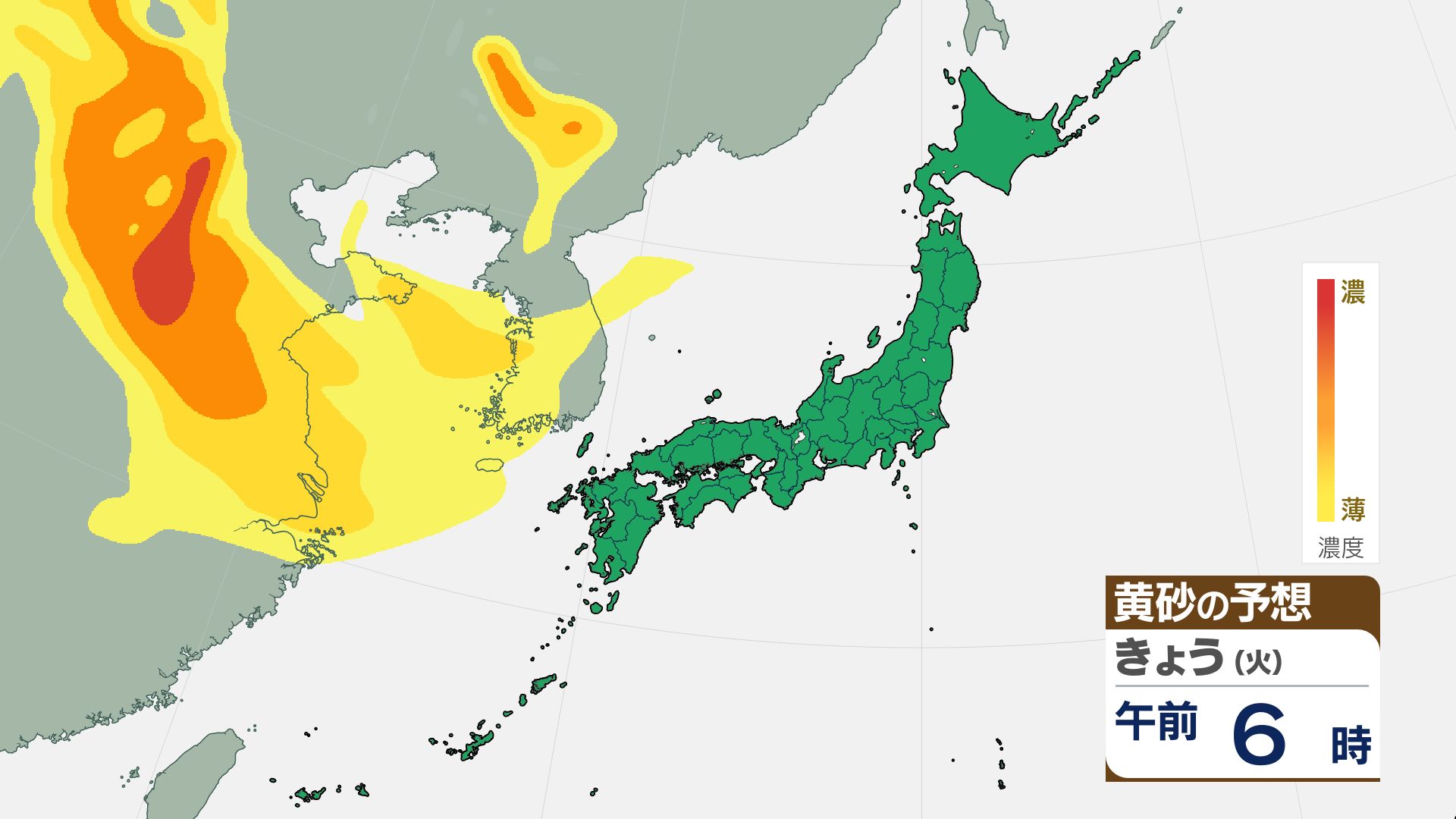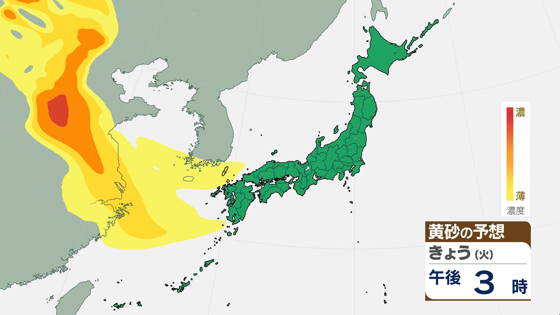 気象庁の黄砂解析予測図によりますと、黄砂は15日夜には日本海側に飛来し、16日(金)には日本列島の広い範囲が覆われる見込みです。屋外への洗濯物干しなどに注意が必要になる可能性があります。