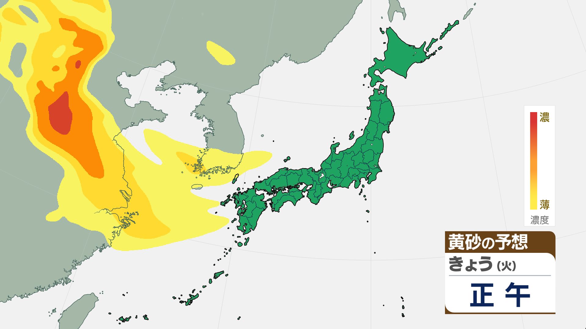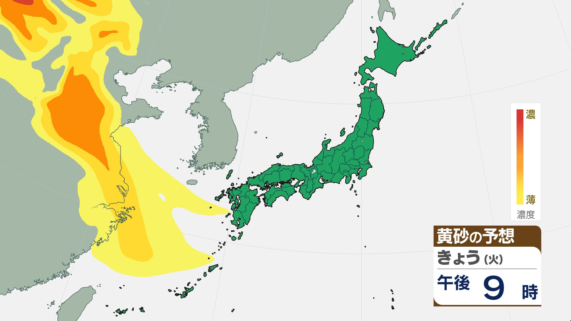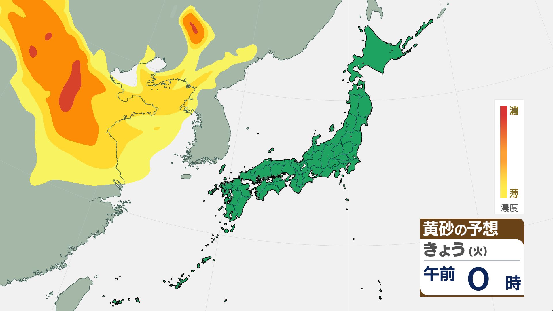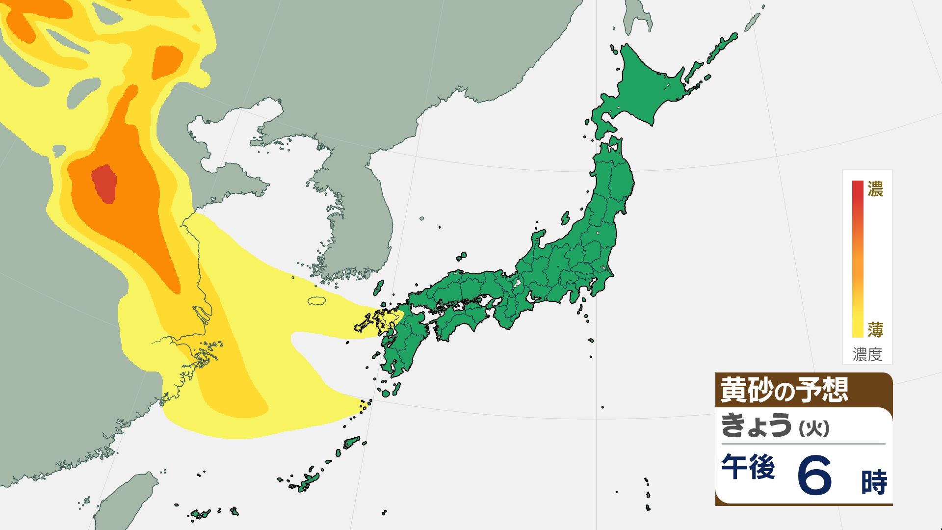 気象庁の黄砂解析予測図によりますと、黄砂は15日夜には日本海側に飛来し、16日(金)には日本列島の広い範囲が覆われる見込みです。屋外への洗濯物干しなどに注意が必要になる可能性があります。