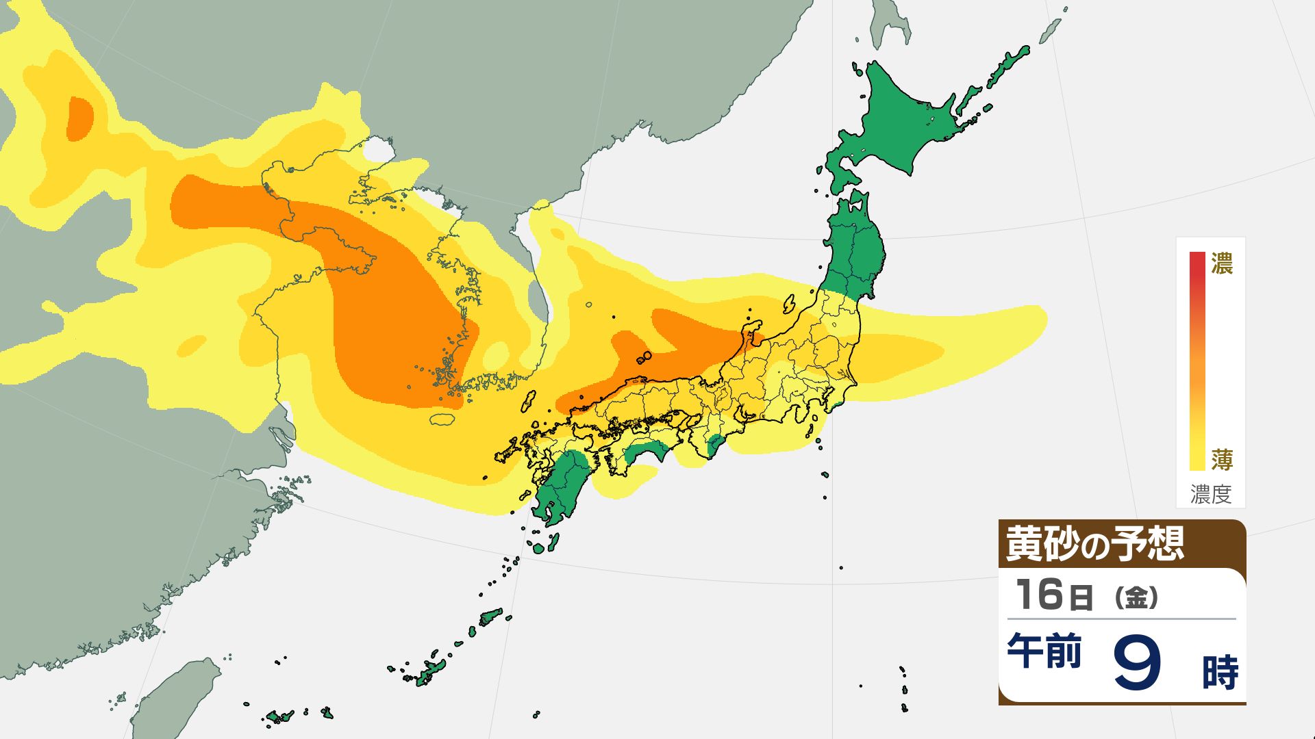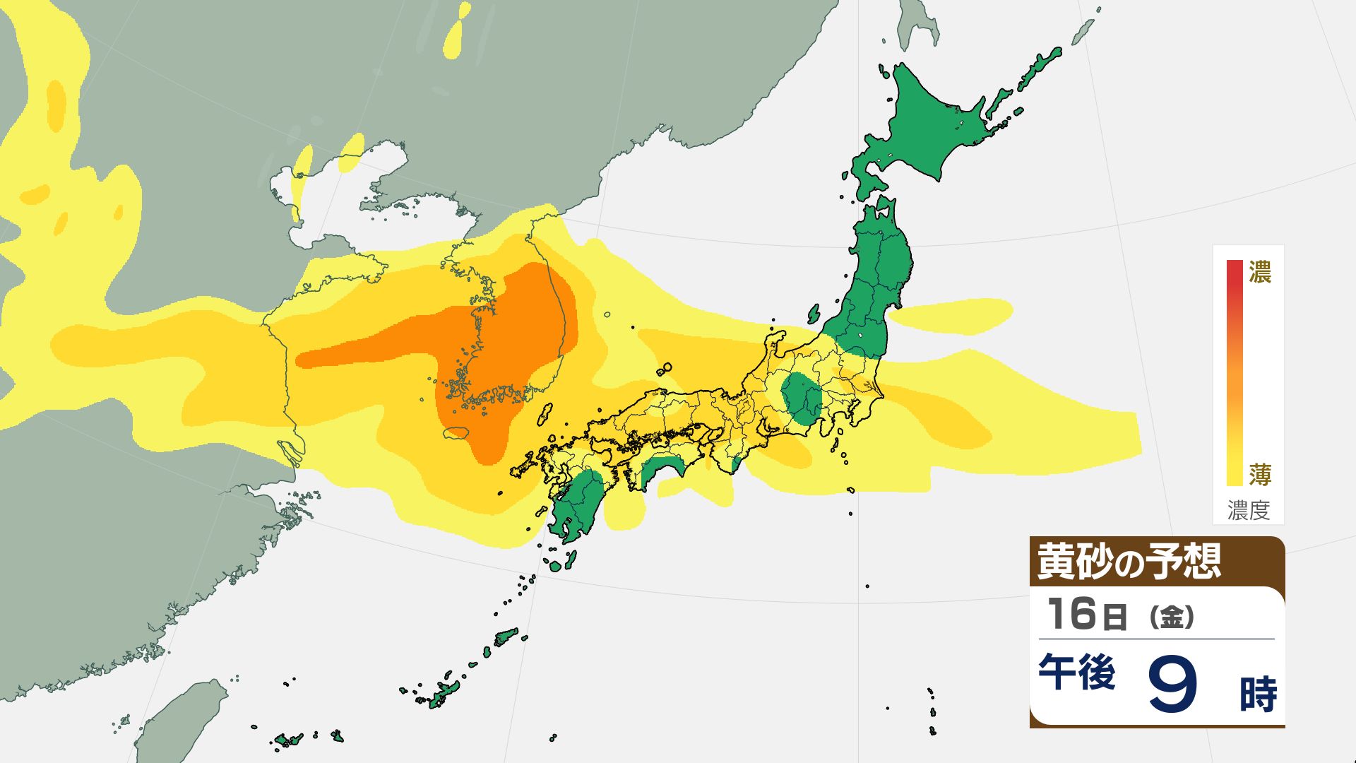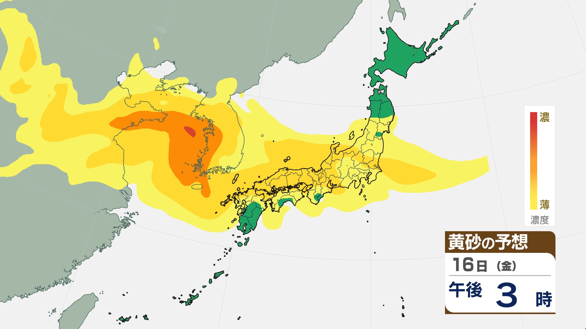 【黄砂情報】16日(金)には関東甲信など広い範囲が覆われる見込み【3時間ごとの黄砂予想シミュレーション画像】気象庁 屋外での洗濯物などに注意