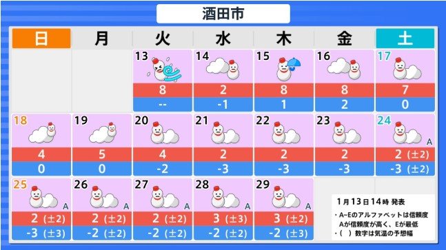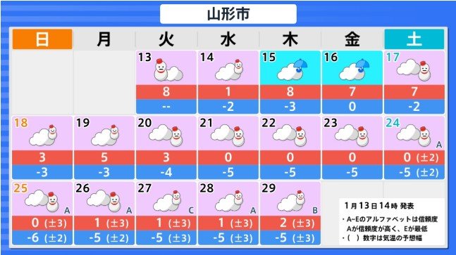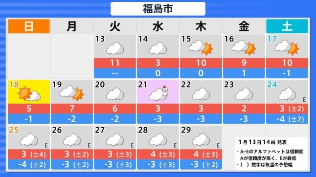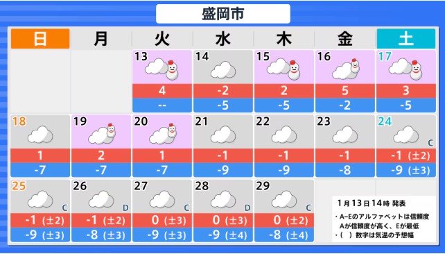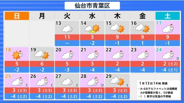 東北地方の気温は、向こう6日間程度は寒気の影響を受けにくいため平年並か高い日が多いですが、その後は冬型の気圧配置が強まる時期があり、寒気の影響を受けやすいため低い日が多く、20日頃からはかなり低くなる可能性があります。また、20日頃からは東北日本海側を中心に降雪量がかなり多くなる可能性があります。農作物の管理や水道管の凍結等に注意するとともに、除雪などの対応に留意してください。