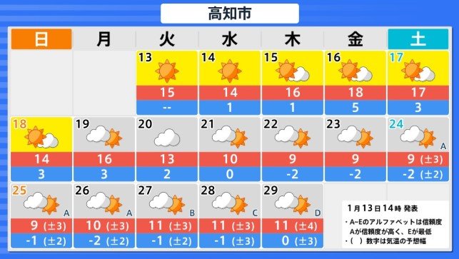 四国地方の気温は、向こう1週間程度は寒気の影響を受けにくいため高い日が多いですが、その後は冬型の気圧配置が強まる時期があり、寒気の影響を受けやすいため低く、21日頃からはかなり低くなる可能性があります。農作物の管理や水道管の凍結等に注意してください。