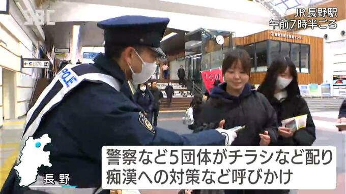 JR長野駅では14日朝、警察など5つの団体がチラシなどを配って痴漢への対策などを呼びかけました。