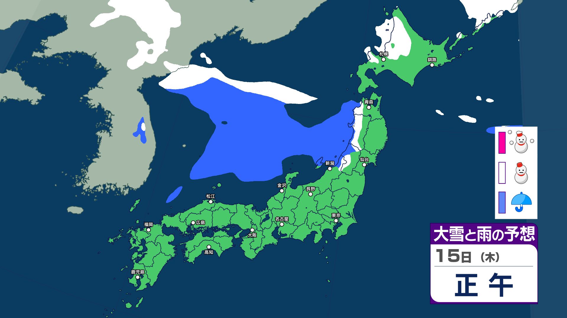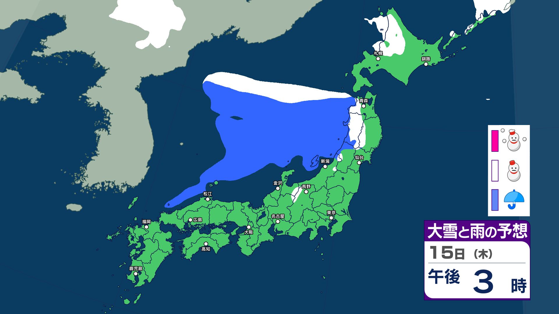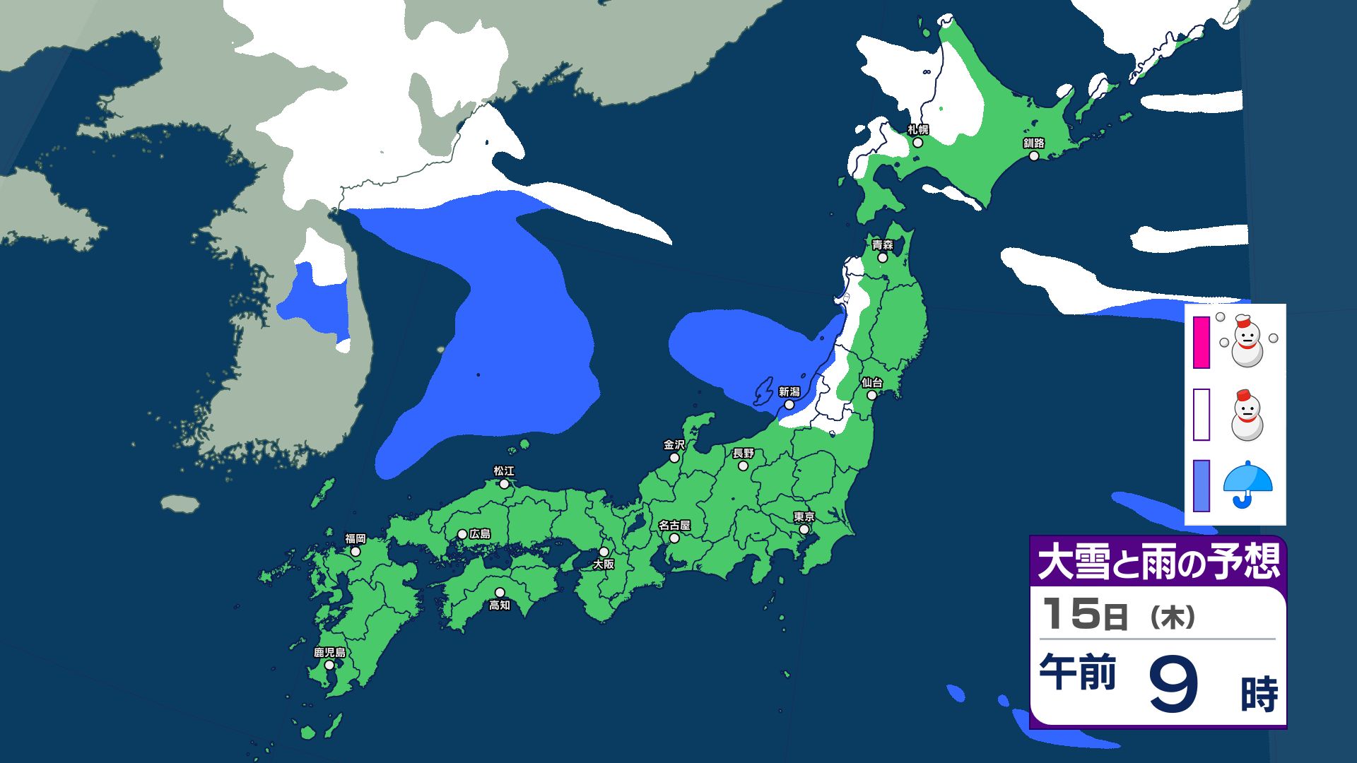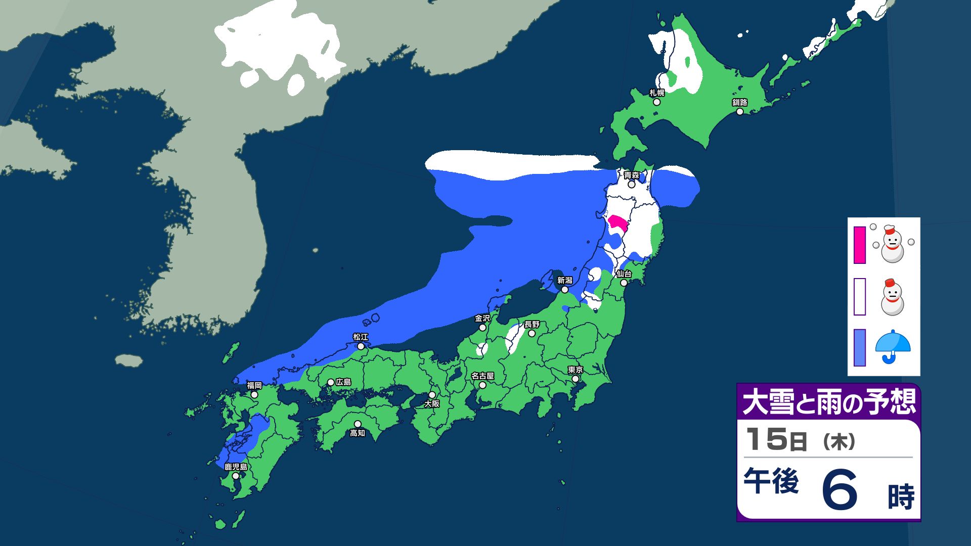 寒冷前線が西日本から北日本を通過する見込み…東日本も16日にかけて急な強い雨などに注意 【雪と雨のシミュレーション掲載 1月20日まで】 2026年1月15日(木) 06:30 国内 【雪と雨のシミュレーション掲載 1月15日~20日】