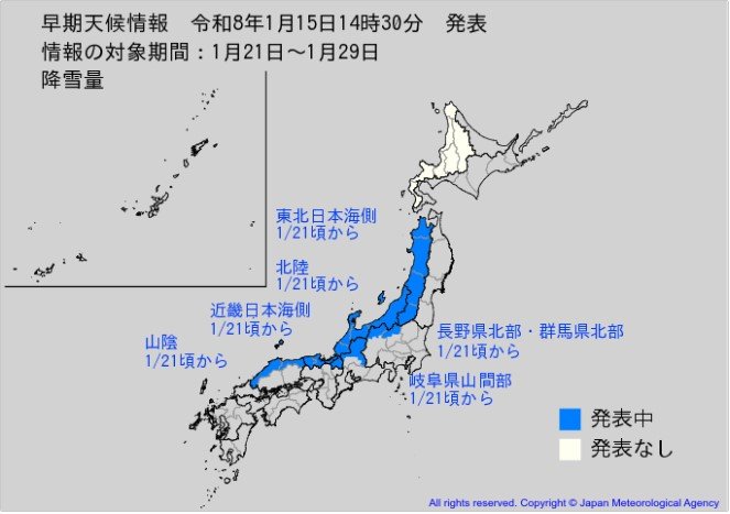 低温と大雪に関する早期天候情報は、その時期としては10年に1度程度しか起きないような著しい低温、降雪量(冬季の日本海側)となる可能性が、いつもより高まっているときに、6日前までに注意を呼びかける情報です。6日先から14日先までの期間で、5日間平均気温が「かなり低い」となる確率が30%以上、または5日間降雪量が「かなり多い」となる確率が30%以上と見込まれる場合に、発表される情報です。