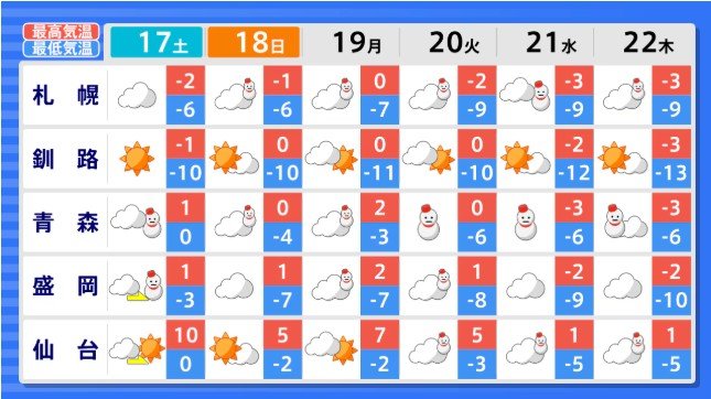 東北地方の気温は、向こう5日間程度は寒気の影響を受けにくいため平年並か高いですが、その後は冬型の気圧配置が強まる時期があり、寒気の影響を受けやすいため低く、21日頃からはかなり低くなる見込みです。また、21日頃からは東北日本海側を中心に降雪量がかなり多くなる可能性があります。農作物の管理や水道管の凍結等に注意するとともに、除雪などの対応に留意してください。