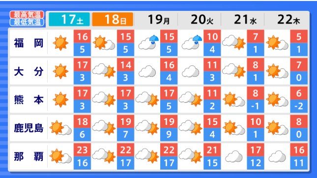 九州南部・奄美地方の気温は、向こう5日間程度は寒気の影響を受けにくいため高く、かなり高い日もありますが、その後は冬型の気圧配置が強まり、寒気の影響を受けやすくなるため低い日が多く、21日頃からはかなり低くなる見込みです。気温の変動が大きいでしょう。農作物の管理や水道管の凍結等に注意してください。
