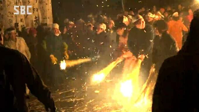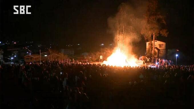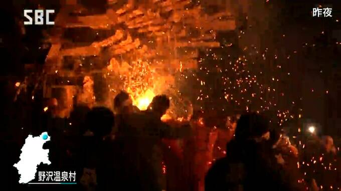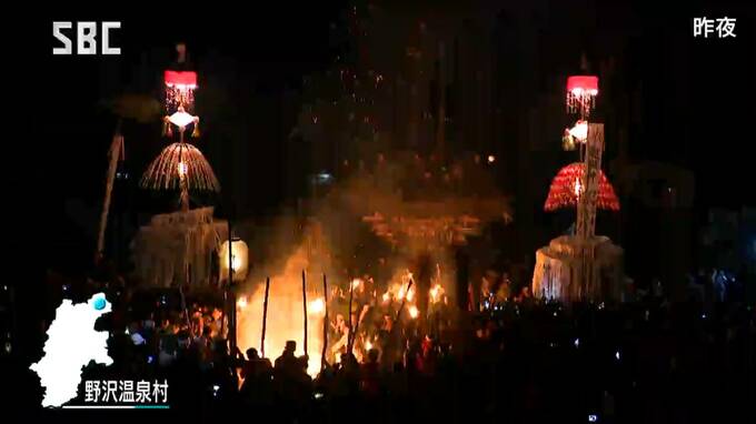 野沢温泉村で15日夜、激しい火の攻防で知られる伝統の道祖神祭りが行われました。