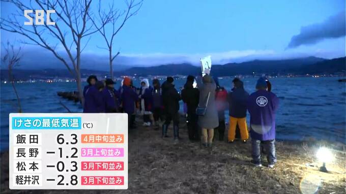 諏訪市のけさの最低気温は氷点下0.6度と平年よりも5度以上高く、さらに風も強く湖面に氷は張りませんでした。