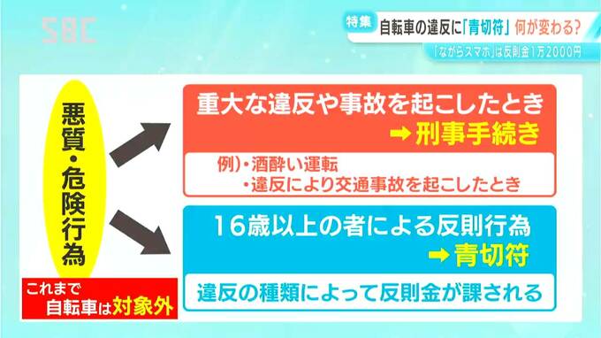 4月からはその手続きが変わります。酒酔い運転や実際に事故を起こした場合には車と同じように刑事手続きによって処理されます。それ以外の交通違反を行った16歳以上の人には「青切符」が交付され、違反者は反則金を支払わなければいけません。これまで自転車は対象外でした。