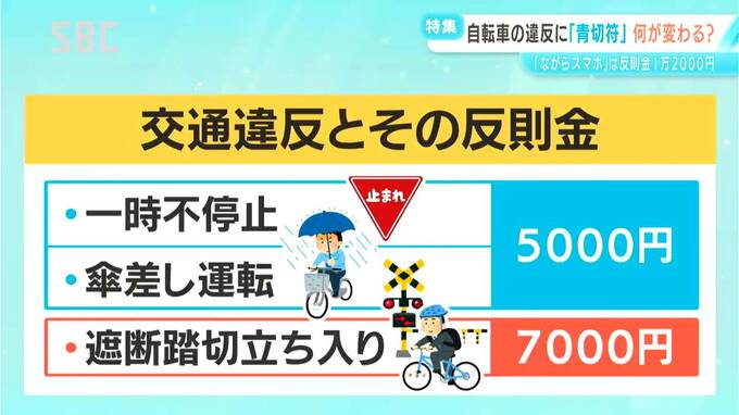 反則金の額は違反ごとに異なり、たとえば、一時停止の標識がある場所で停止しなかった場合や、傘を差しながらの運転は5000円。また、遮断機が閉じようとしているときや、警報機が鳴っているときに踏切に入った場合は7000円となっています。
