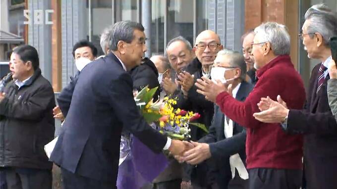 安曇野市役所に登庁した中山栄樹市長は、500人ほどの職員などに拍手で迎えられ、感謝の思いを伝えながら庁舎に入りました。