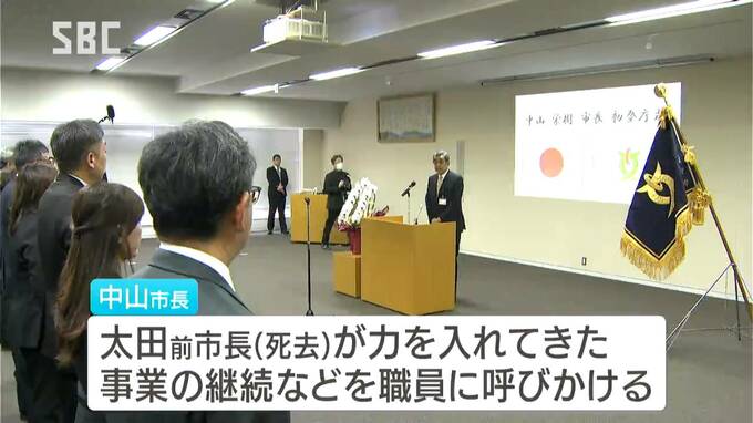初登庁式では、任期途中で死去した太田前市長が力を入れてきた事業の継続などを職員に呼びかけました。
