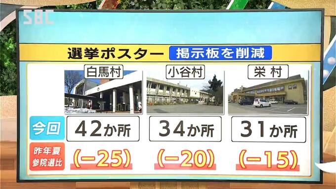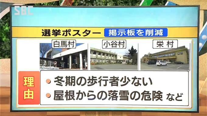 候補者のポスターを貼る掲示板の設置は、冬の選挙の課題のひとつとなっています。豪雪地帯の白馬村・小谷村・栄村では、冬に歩行者が少ない場所や落雪の危険を考慮し、2025年夏の参院選より4割ほど減らします。