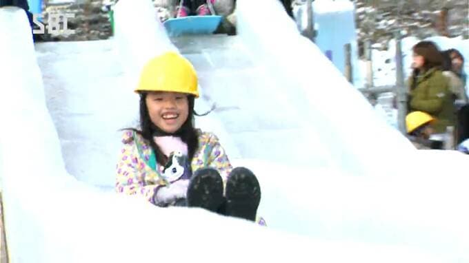 公園には、氷で作られた「ジャンボ滑り台」も設けられ、子どもたちがそりに乗って勢いよく滑り歓声をあげていました。
