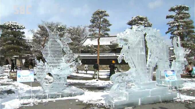 松本城をバックに並ぶ迫力いっぱいの氷の彫刻。恒例の「国宝松本城氷彫フェスティバル」は25日まで3日間の日程で開催されました。