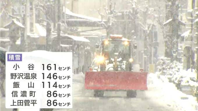 気象台によりますと、午後3時現在の各地の積雪は小谷161センチ、野沢温泉146センチ、飯山114センチ、信濃町と上田市菅平が86センチなどとなっています。