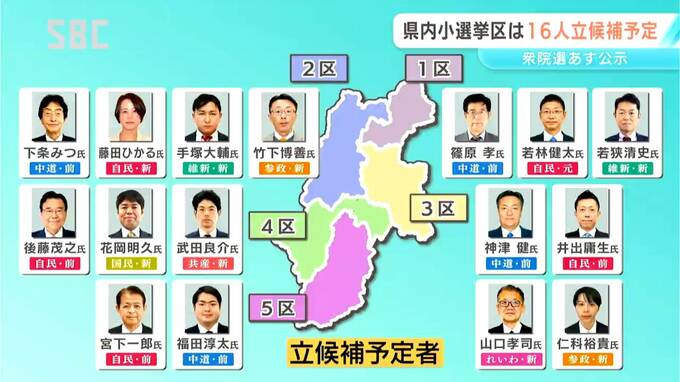 今回の総選挙で、県内5つの小選挙区には、1区3人、2区4人、3区4人、4区3人、5区2人の合わせて16人が立候補を予定しています。