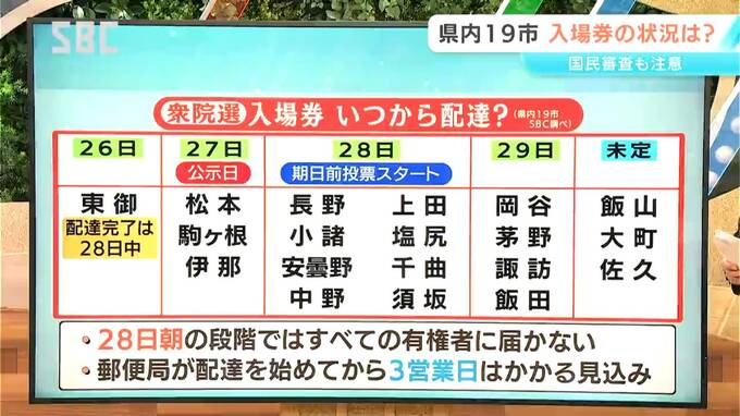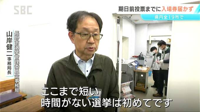 解散から投開票までの期間が戦後最短16日の今回の衆院選。長野県内の自治体はあす・27日の公示を前に準備を急ぎますが、19すべての市で期日前投票が始まる28日までに投票所入場券が有権者の手元に届かないことが、SBCのまとめで分かりました。