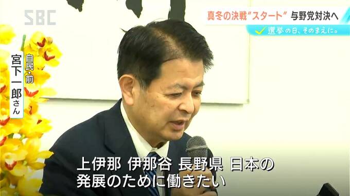 宮下一郎さん(あいさつ):「きのう解散をしまして実質的にもう戦いの火ぶたが切って落とされたと。私もなくてはならないと自任しておりまして、なんとか皆さんの力で大変厳しい戦いですけれども、引き続き垣内さんとともに、上伊那・伊那谷・長野県・日本の発展のために働きたい」