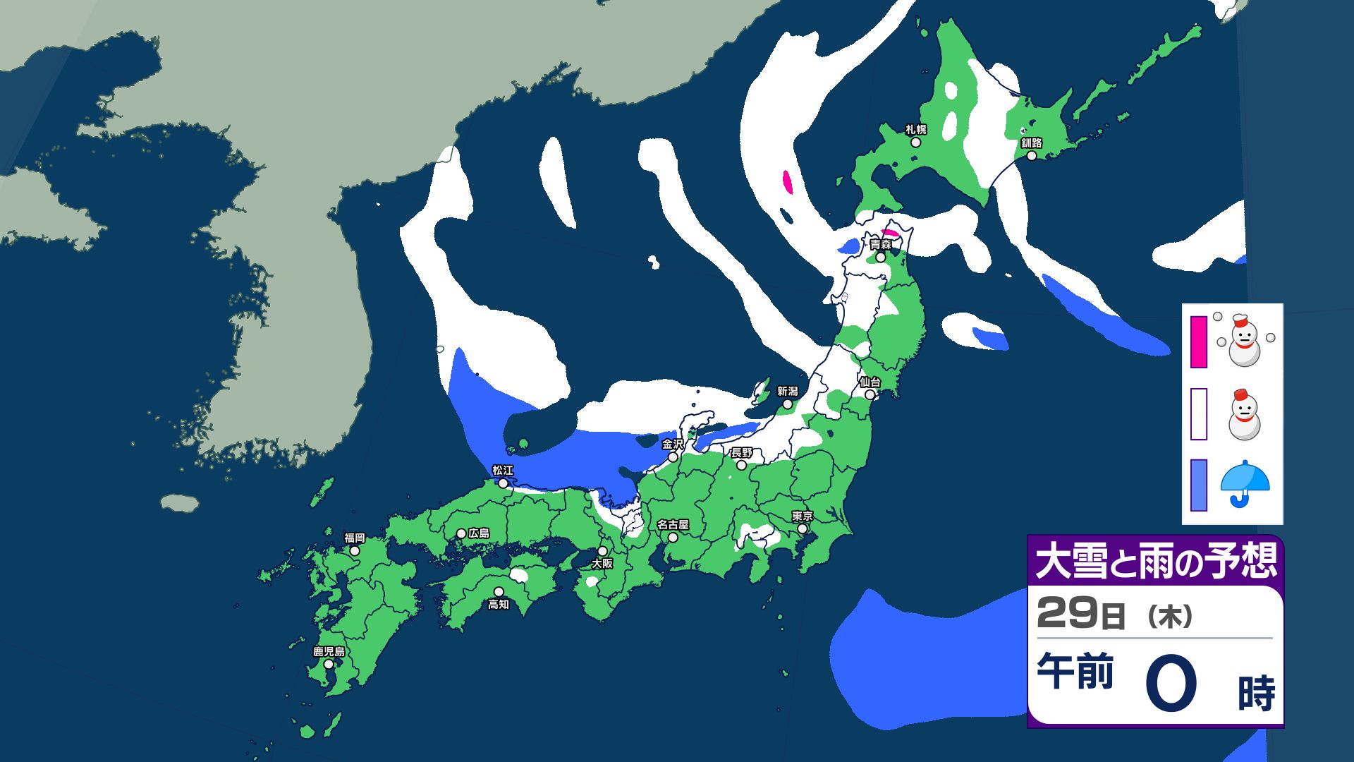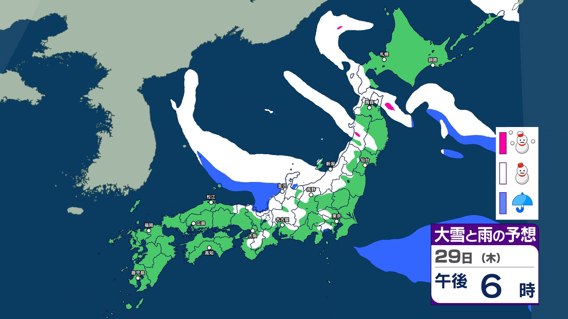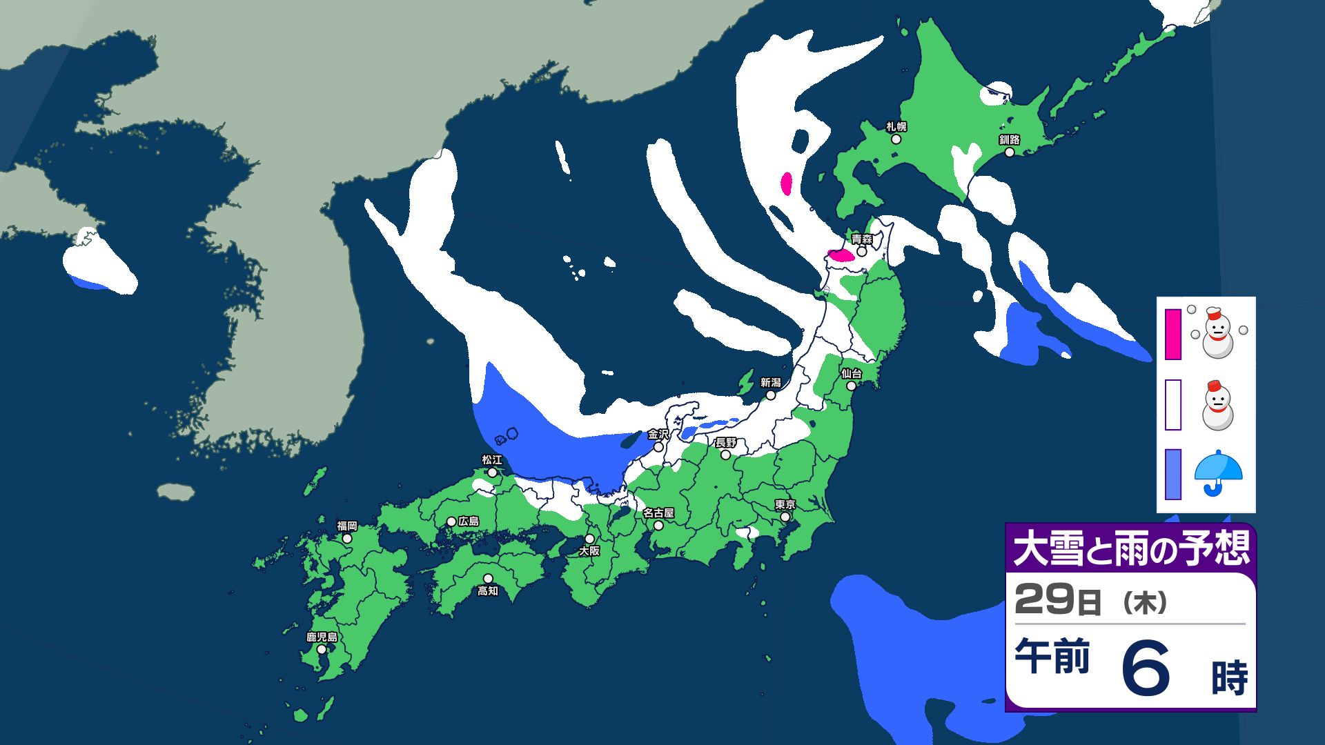 【関東でも、雪か】東北地方と東日本~西日本の日本海側を中心に大雪の見込み【雪のシミュレーション掲載】気象庁 29日~30日予想降雪量 北陸70センチ 東海40センチ 近畿50センチ(~午後6時・多い所)東日本~西日本の太平洋側で大雪になる所も|TBS NEWS DIG