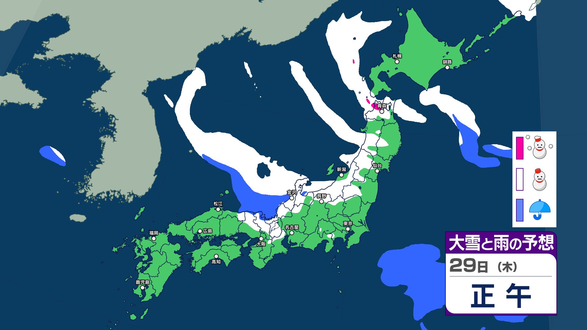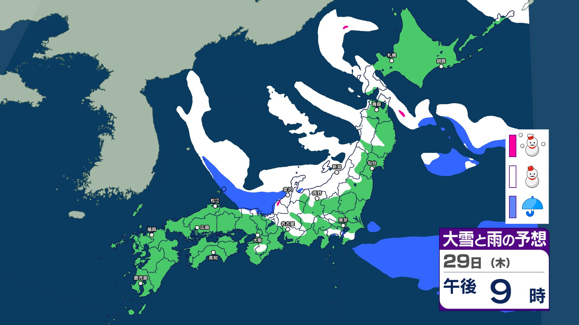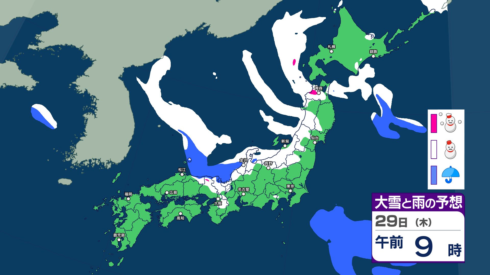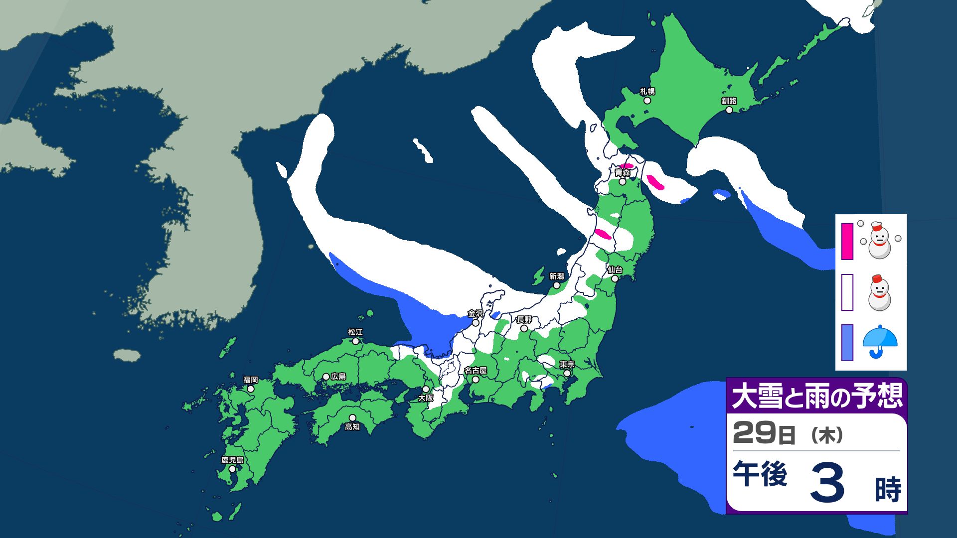 【関東でも、雪か】東北地方と東日本~西日本の日本海側を中心に大雪の見込み【雪のシミュレーション掲載】気象庁 29日~30日予想降雪量 北陸70センチ 東海40センチ 近畿50センチ(~午後6時・多い所)東日本~西日本の太平洋側で大雪になる所も|TBS NEWS DIG